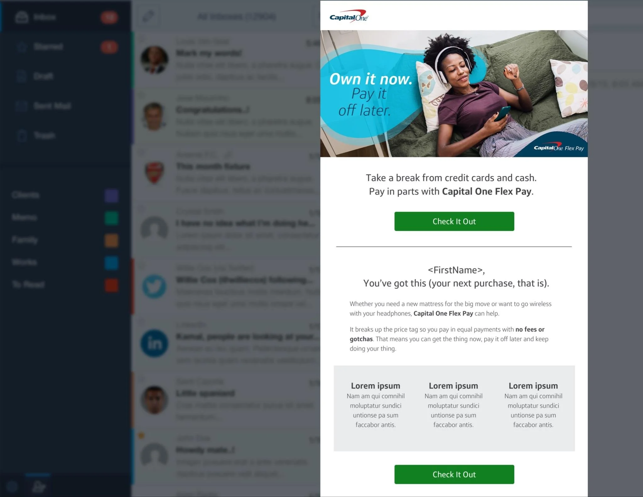 I worked on the Capital One account at Hawkeye for 3+ years, creating winning direct mail and email campaigns, crafting messaging for SEO and more across brand cards and a variety of their partnership cards. One of the projects we got to work on was for their branded “buy now, pay later” product: Capital One Flex Pay.